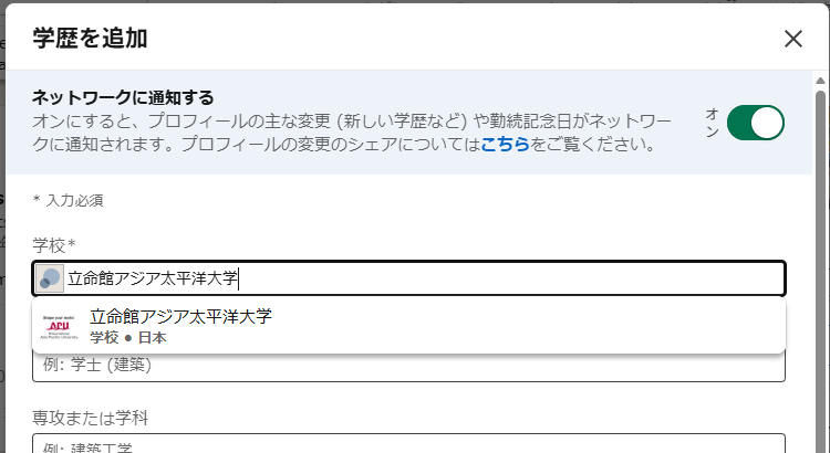「Ritsumeikan Asia Pacific University」を入力して学歴に追加し、卒業生とネットワークを広げましょう!